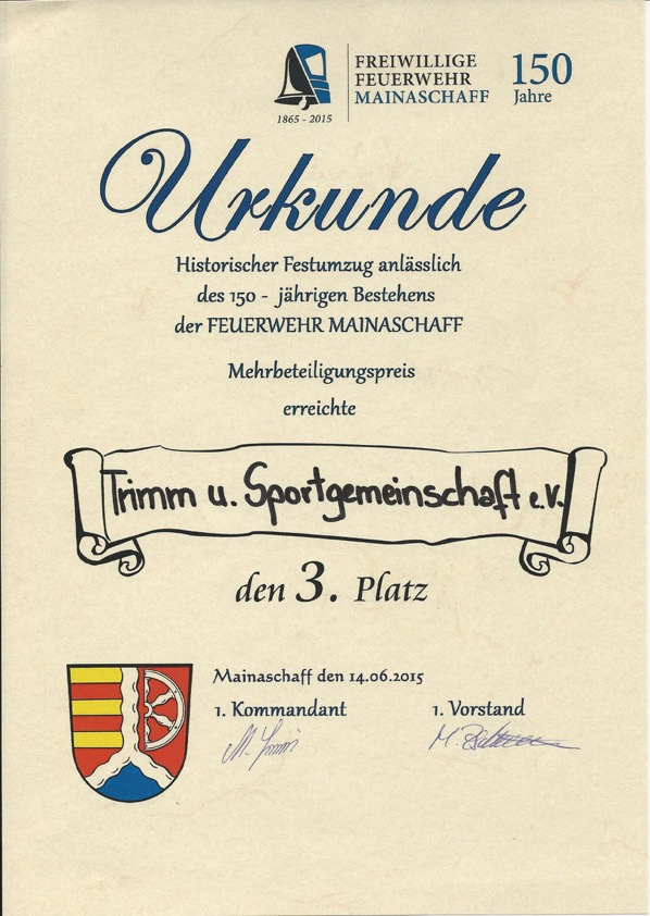 Für die zahlreiche Teilnahme am Festzug der Freiwilligen Feuerwehr Mainaschaff anläßlich der 150 Jahr Feier am 14.06. ergeht ein herzliches DANKESCHÖN an alle Mitglieder. Von 35 teilnehmenden Gruppen/Vereinen haben wir den 3. Platz bei der Meistbeteiligung errungen, das ist eine tolle Leistung !
